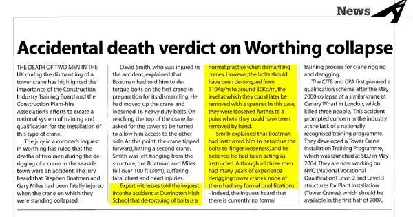 If anyone knows of other similar tower crane collapses due to mast bolt loosening, please email me details.